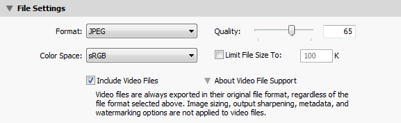 Next, set “Color Space” to sRGB – that’s what most monitors on the Internet are able to see properly. Don’t check “Limit File Size To” and you can keep “Include Video Files” checked – it has no effect on images anyway.