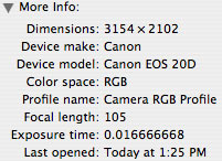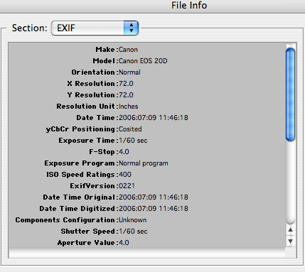 3. The last way of viewing EXIF data that we’ll talk about is via your image editing software. I’m using Photoshop Elements 2.0 today (for Mac) so in this software I go to the ‘File’ menu then choose ‘File Info’. This allows me to view two types of information about the image ‘general’ and ‘EXIF’. When i choose the EXIF option I get this: