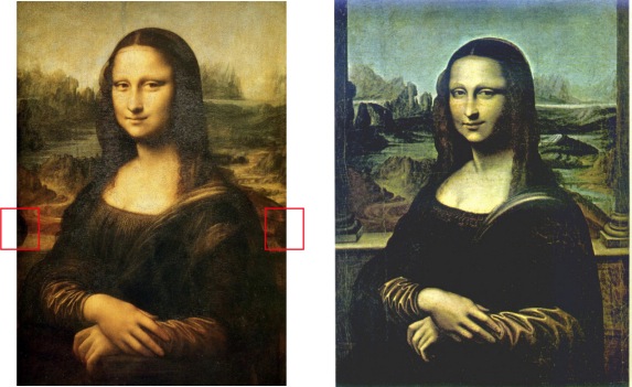 One of the things that I’d not noticed about the Mona Lisa before that i read about today is that on either side of the subject just under and to the side of each of her shoulders there is half of a round ball shape (see the images below on the left).